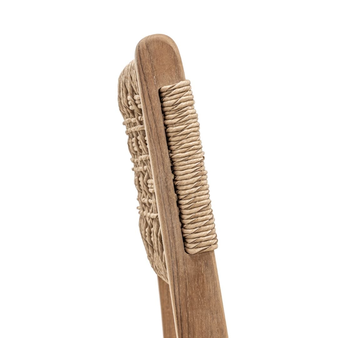Une chaise de salle à manger d'extérieur élégante combinant du rotin synthétique tissé à la main et du bois de teck pour un look naturel et texturé.