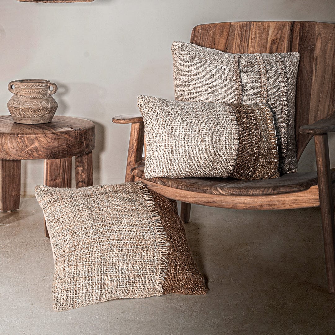 Le coussin rectangulaire Etera (30 x 50 cm) se distingue par son design superposé composé de trois panneaux de tissu cousus aux tons chauds et naturels. Chaque section est reliée par des détails visibles cousus main qui confèrent à la pièce un aspect artisanal et texturé.