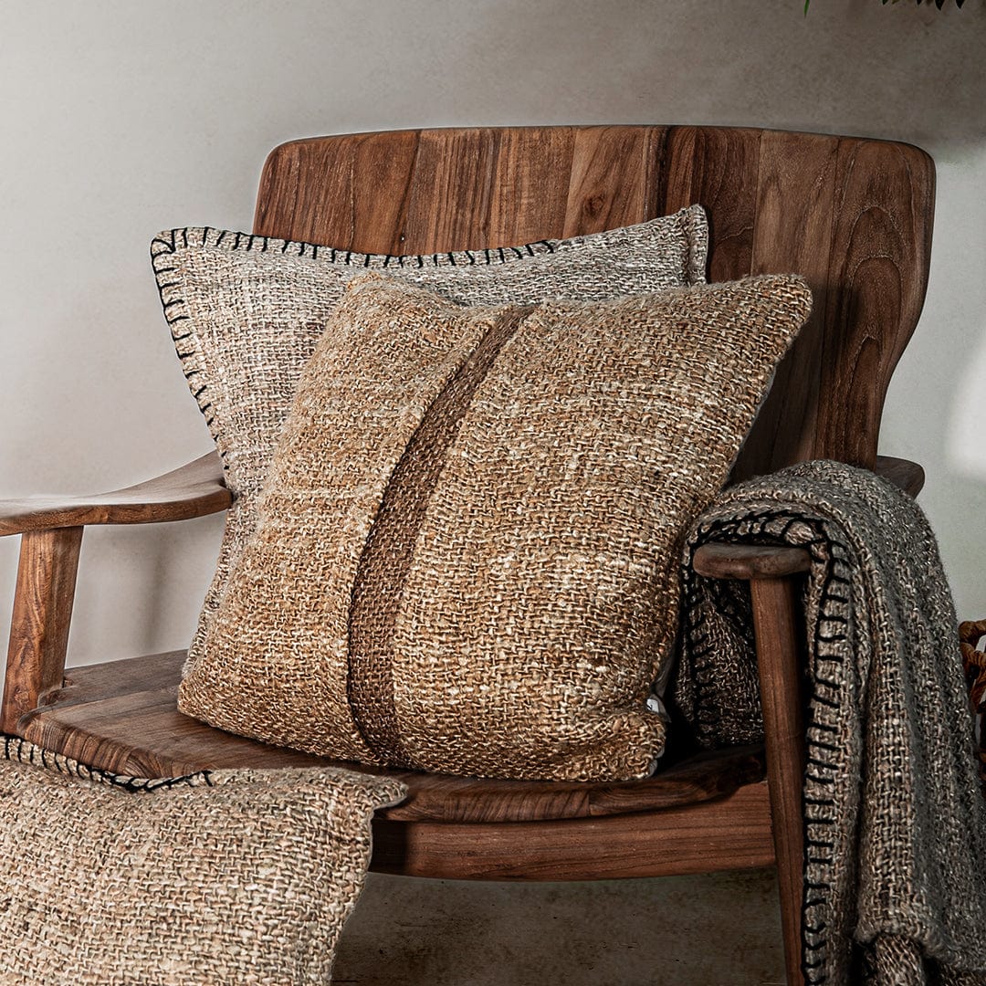 Le coussin carré Etera apporte une élégance naturelle et un contraste subtil à votre intérieur. Doté d'un motif à deux épaisseurs avec une bande centrale marron foncé sur une base naturelle chaleureuse et texturée, il ajoute profondeur et charme tactile à n'importe quel décor.