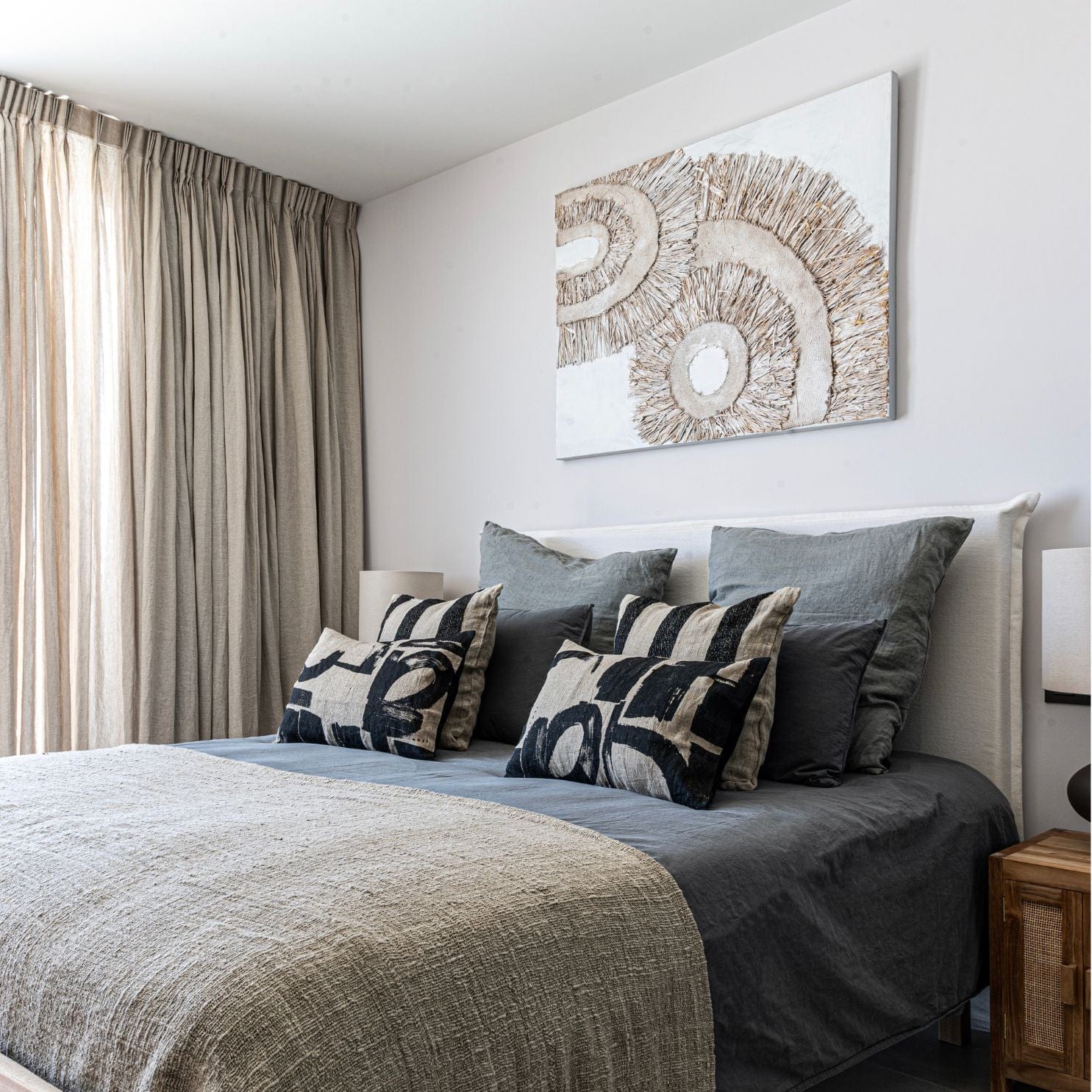 Des formes simples et arrondies tracées avec la texture rugueuse et rugueuse de l'herbe marine et de la toile trempée composent cette pièce, une œuvre d'art conceptuelle qui vous emmène sur une plage d' Ibiza .