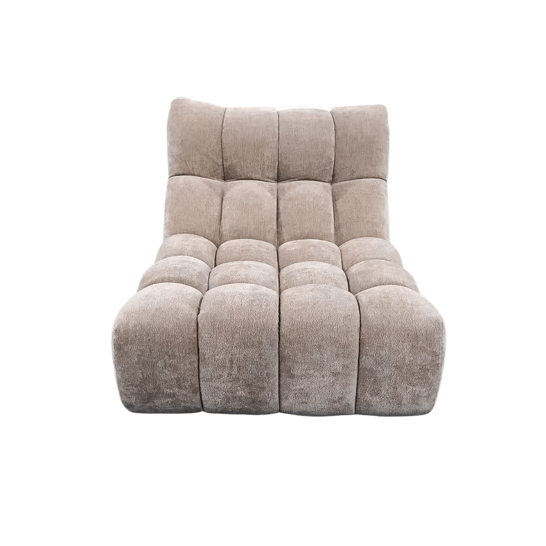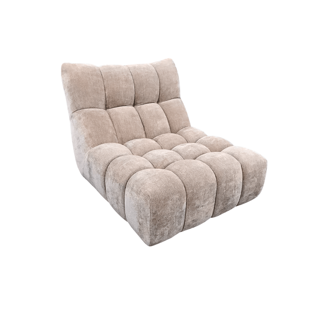 Le fauteuil Riviera incarne l'identité sculpturale de la collection Riviera dans un format compact. Revêtu d' un doux tissu taupe à la finition texturée, il présente un capitonnage vertical et horizontal profond qui lui confère structure et profondeur visuelle.