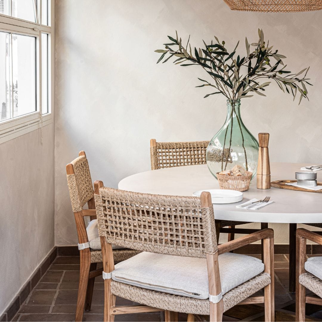 Remarque : Bien que la table Shanti soit adaptée à une utilisation en extérieur, elle doit être placée dans un endroit abrité ou couvert pour préserver la qualité de sa finition au fil du temps. Une exposition directe prolongée à la pluie ou au soleil est déconseillée.