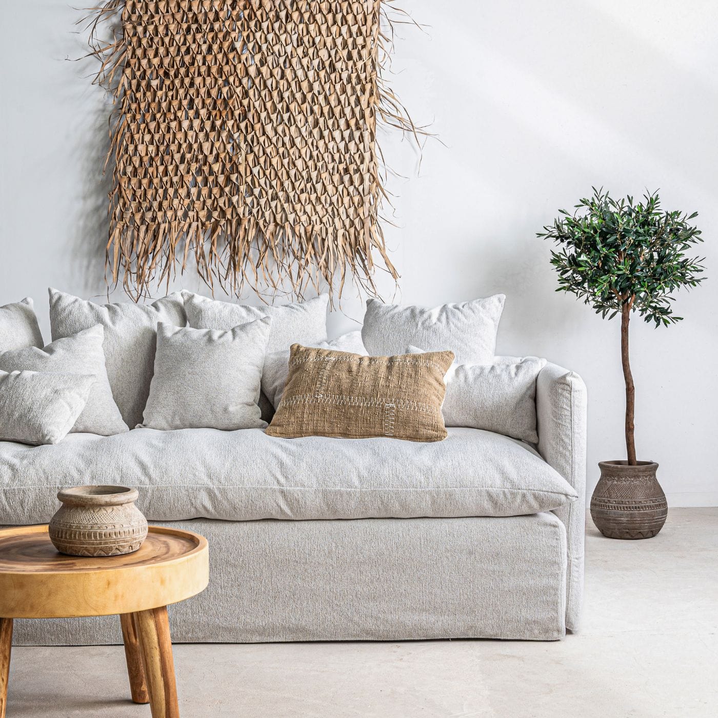 Ce canapé est synonyme de confort. Son assise généreusement rembourrée et son surmatelas en fibre douce au toucher plume offrent une sensation de bien-être qui invite à la détente. Sa silhouette décontractée et sa douce teinte blanc sable texturée apportent une touche apaisante et apaisante à tout intérieur méditerranéen, nordique ou bohème.